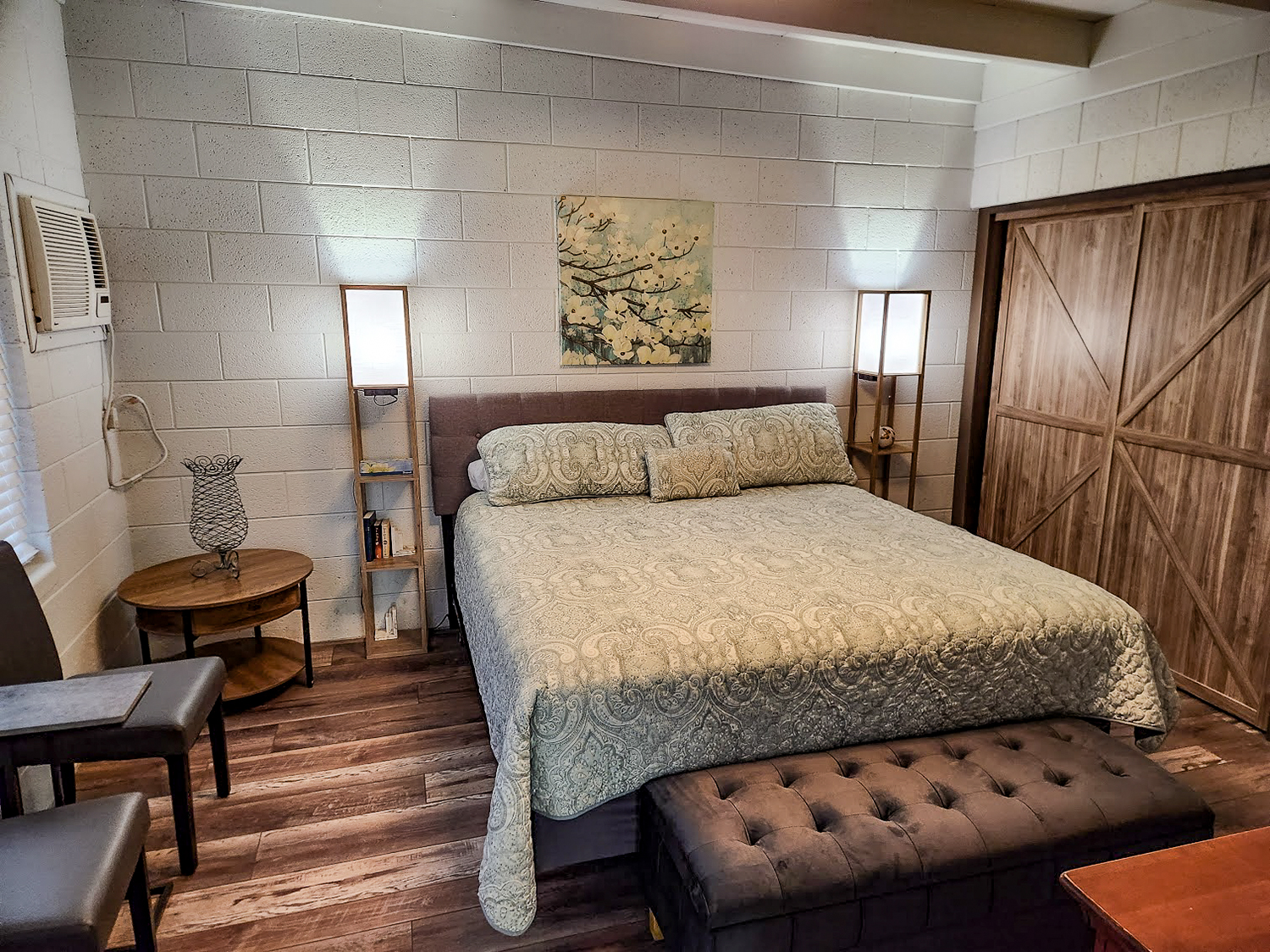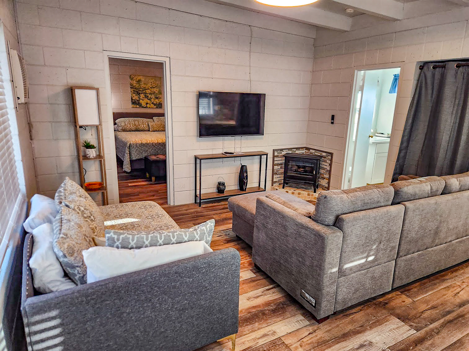 Large two-room suite with bedroom with one King bed, living area with pull-out Queen sofa bed plus twin day-bed. Full kitchen with range, oven, microwave, dishwasher, full-size refrigerator, plus all standard room amenities.
