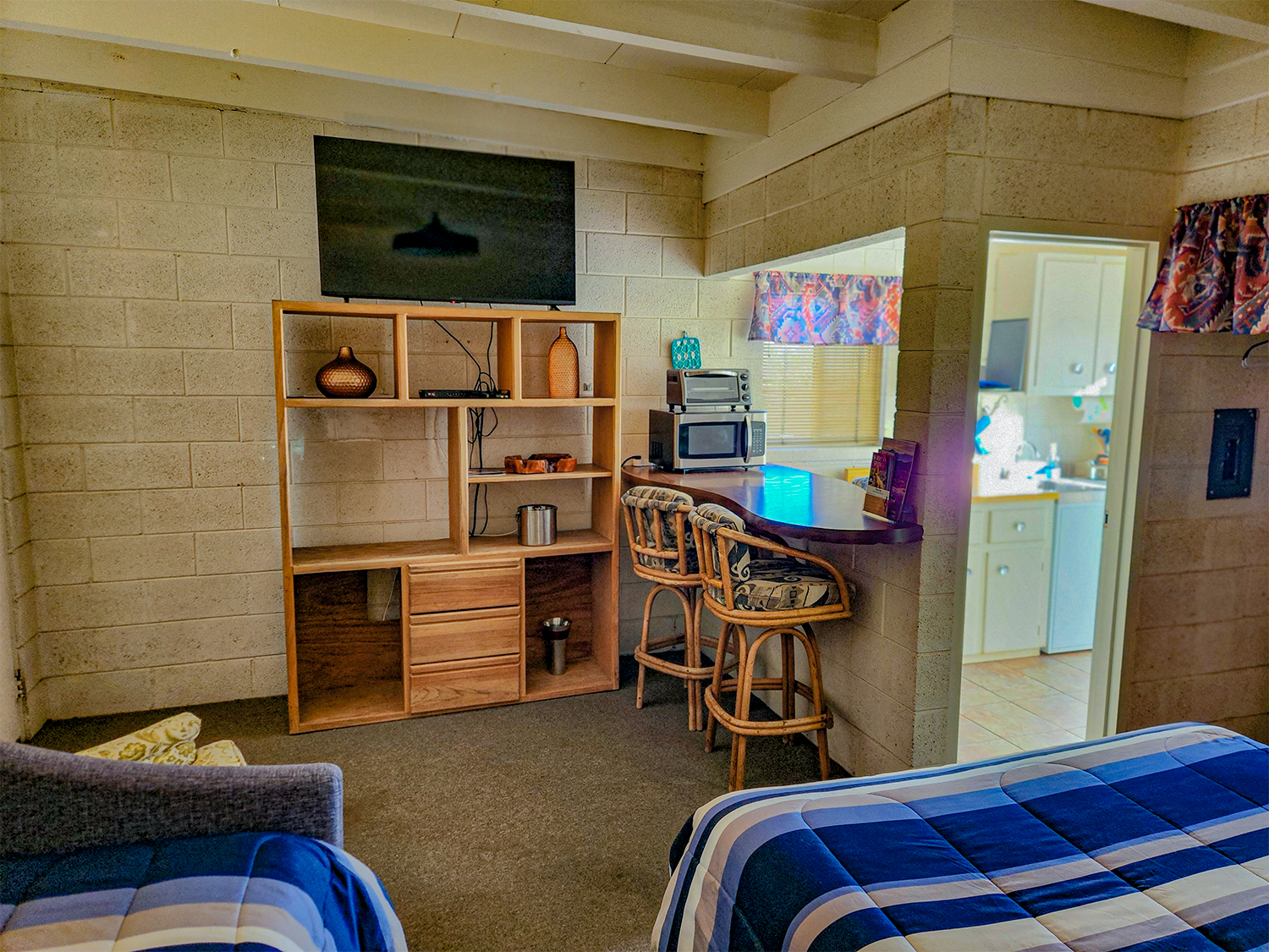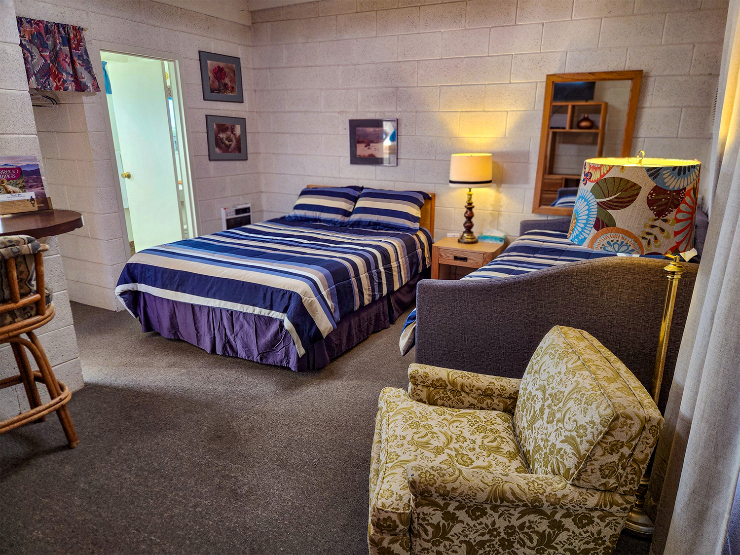 Colorful room with one Queen bed, one Twin day-bed, comfort lounge chair and ottoman, and large kitchenette, plus all standard room amenities. Dogs allowed.